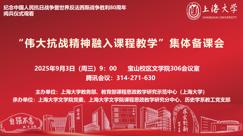 文学院党委书记陆甦颖致欢迎词。上午9点,与会人员通过央视直播共同观看了在北京天安门广场举行的纪念中国人民抗日战争暨世界反法西斯战争胜利80周年纪念大会和阅兵仪式。习近平总书记的重要讲话掷地有声、催人奋进,老师们在回望中汲取奋进力量,在感悟中凝聚民族自信。气势恢宏、震撼人心的阅兵仪式,让全体与会者心潮澎湃,使命感油然而生!