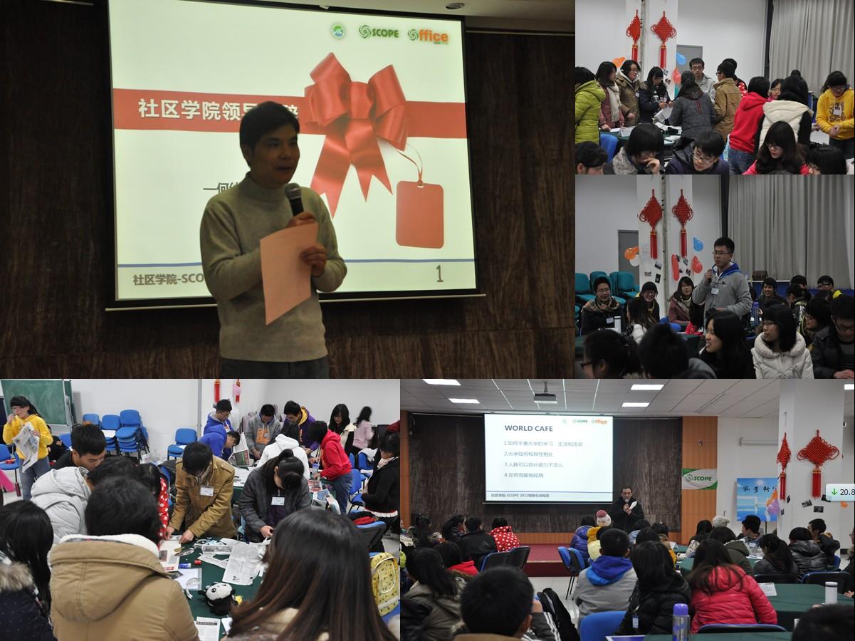 本次社区学院—SCOPE新生训练营由2012年的12月22日的预备营和12月31日晚,2013年一月一日、二日两天一夜的正式营组成,通过设计近20项内容的培训,培养大一新生的大学认同、问题解决、专业探索、时间管理、性格探索、团队精神和协调能力、自信心、领导能力、理财规划理念等,从而提高上大学子的生涯意识,增强未来发展中的综合竞争力和职业化素养。